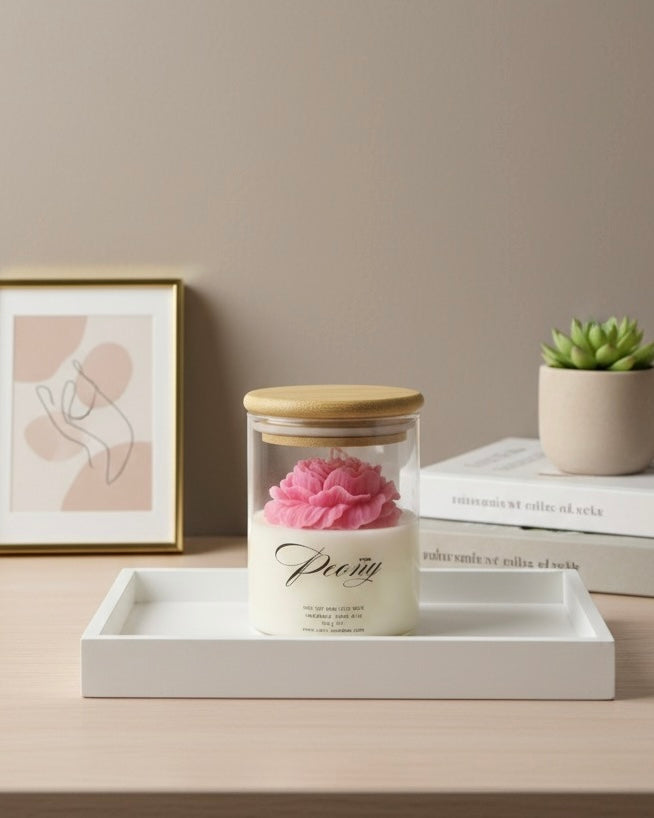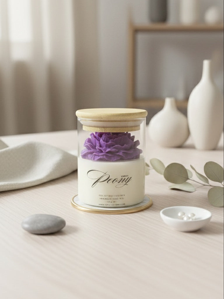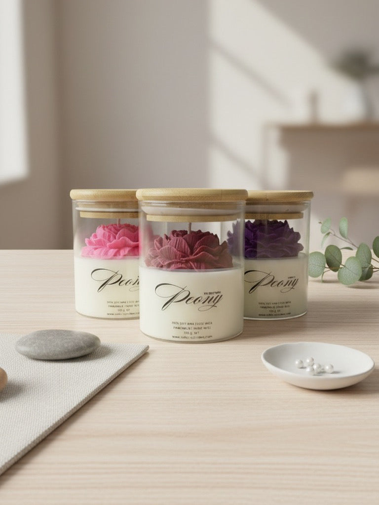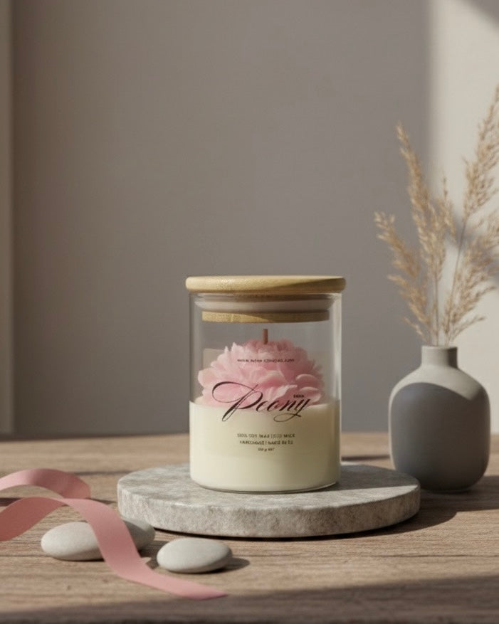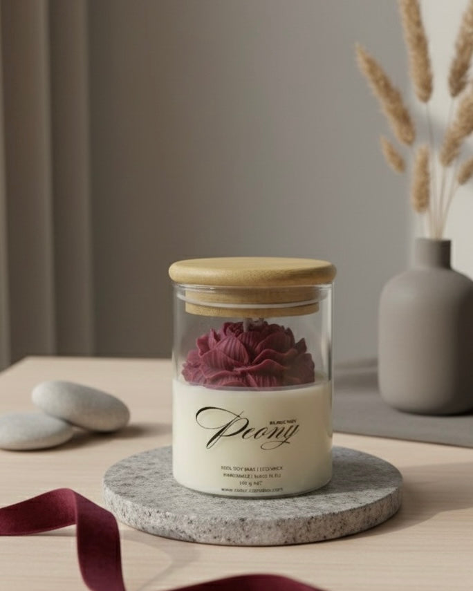 Открийте красотата на ръчното изкуство с нашия божур от 100% соев восък, деликатно оформен и поставен в стилен стъклен буркан с дървен капак. Тази свещ е не само ароматен акцент, но и изящна декорация, която придава уют и естественост на всеки интериор.