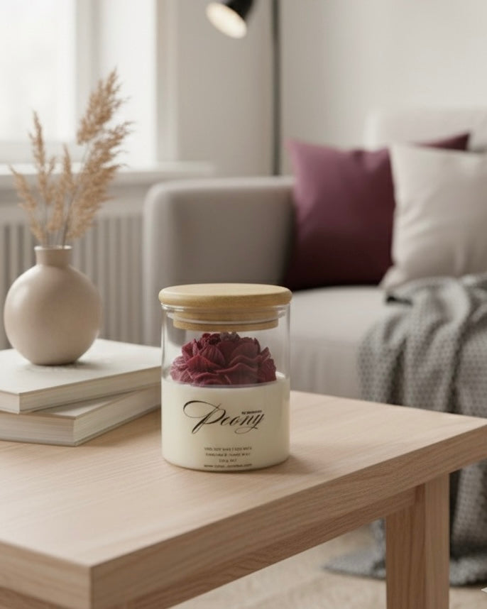 Божур от соев восък в буркан с дървен капак – естествена ароматна свещ с елегантен дизайн