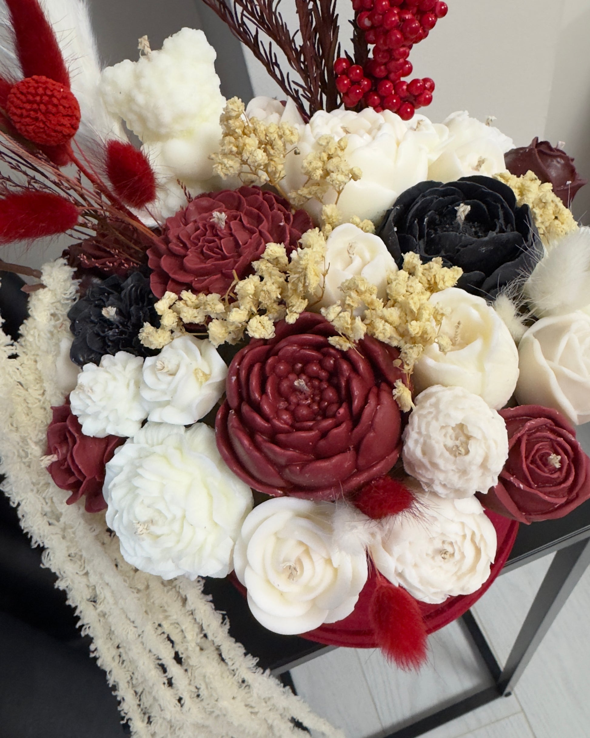 Луксозен букет от ръчно изработени свещи в стилни бордо, бежови и екрю тонове – перфектен избор за модерна домашна декорация или елегантен подарък. Всяко цвете е оформено с внимание към детайла, което създава дълготрайна, ефектна визия, без да увяхва. Изработен от соев восък, с нежен аромат.