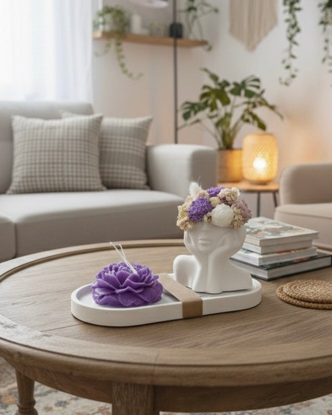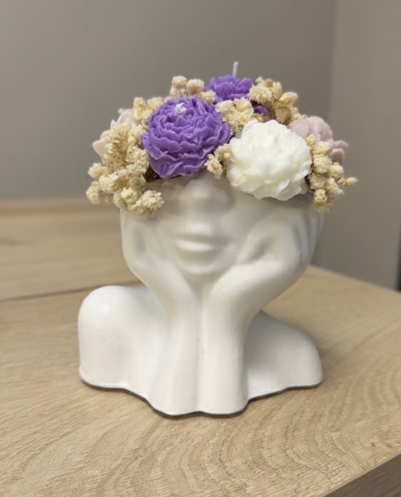 Комбинацията от керамична ваза и флорални елементи от соев восък създава уникална интериорна декорация, която не изисква грижи като истинските цветя, но носи същата свежест и настроение. Перфектно се вписва в модерен, скандинавски, романтичен или класически интериор.