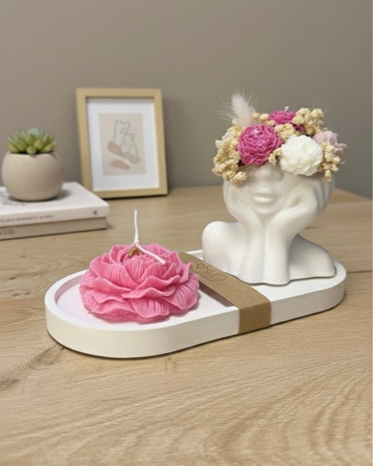 Внесете нежност, стил и романтика в интериора си с нашия керамичен декор със соеви свещи – елегантна ваза, изпълнена с ръчно оформени рози и божур от 100% натурален соев восък. Този продукт е истинско произведение на изкуството, съчетаващо ароматна свещ, дизайнерска керамика и флорална композиция, която изглежда като жива.