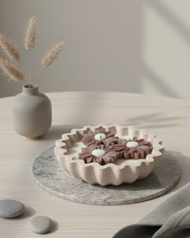 Маргаритки от соев восък в керамична купа – ръчно изработена декоративна свещ за уют и стил